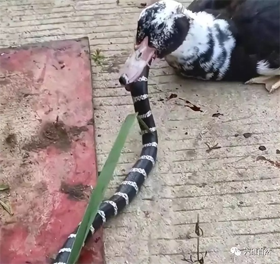 福建一条银环蛇闯入村民家 被大黑鸭吞了半个蛇身,可鸭子也难活