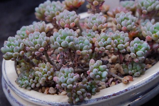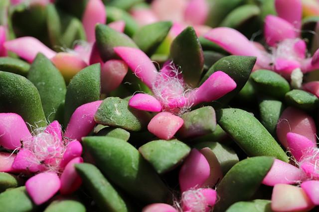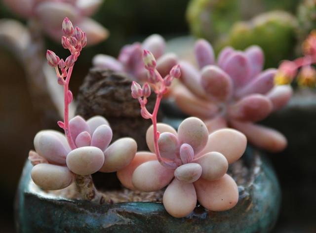 吹雪之松锦株高仅5厘米,叶色倒卵形,叶腋间有白色丝状毛,开玫瑰色小花。