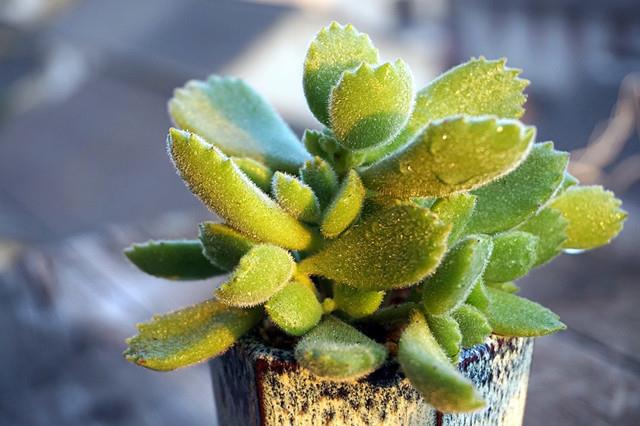 熊童子,叶形叶色较美,花朵玲珑小巧,叶片形似小熊的脚掌,形态奇特,十分可爱,观赏价值很高。