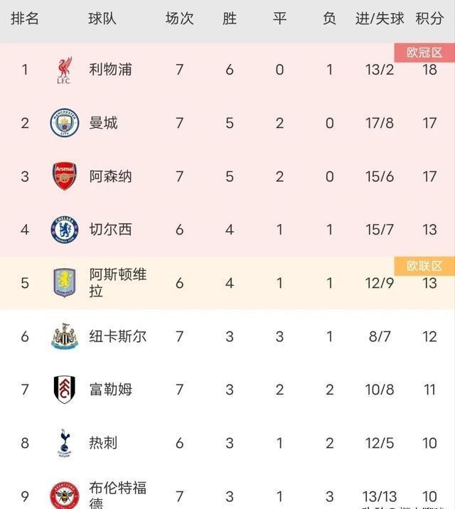 英超最新排名利物浦第一,曼城第二,阿森纳第三,曼联第14!