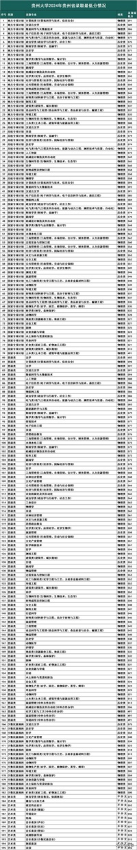 以下贵州大学2024年贵州省各类别、各专业录取最低分情况