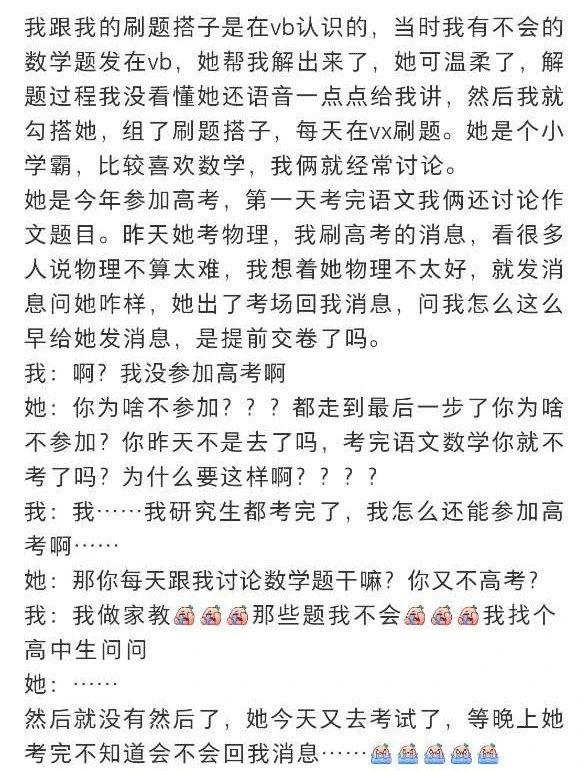 事情的经过是这样,发帖人在微博认识了一个 " 刷题搭子 ",那是一个即将参加高考的高三女生。