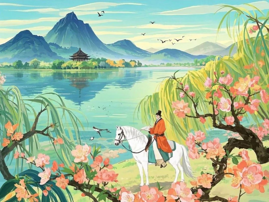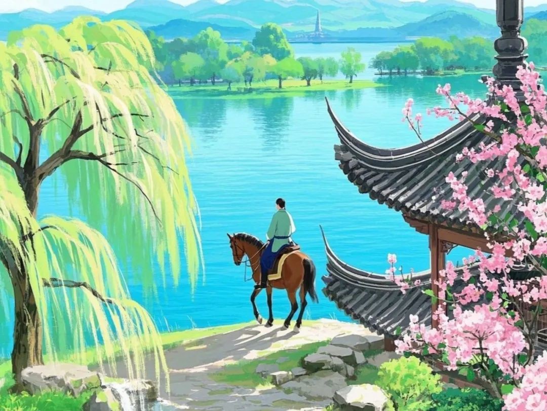但在西湖的春天里,他依然像个孩子般雀跃——会为发现第一朵野花惊喜,会驻足听黄莺吵架,会骑着马故意蹭过青草地。