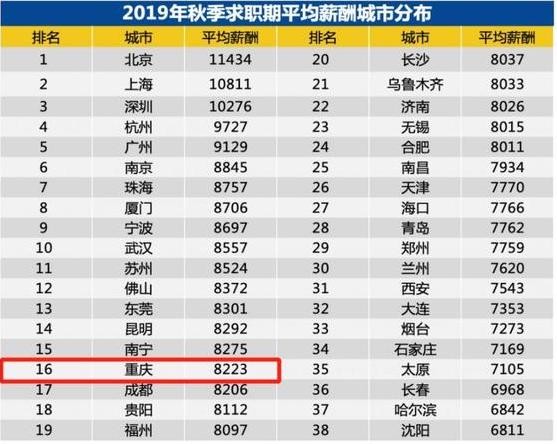 近日某招聘网站发布了《2019年秋季中国雇主需求与白领人才供给报告》,2019年秋季,全国38个主要城市的平均招聘月薪为8698元,其中重庆第三季度平均薪酬是8233元/月,排在全国38个城市中第十六位,和上一个季度的8020元/月,重庆第三季度又涨了200多元。虽然重庆的平均薪酬又一次上涨,但是和全国的平均薪酬相比较还是有一段距离。