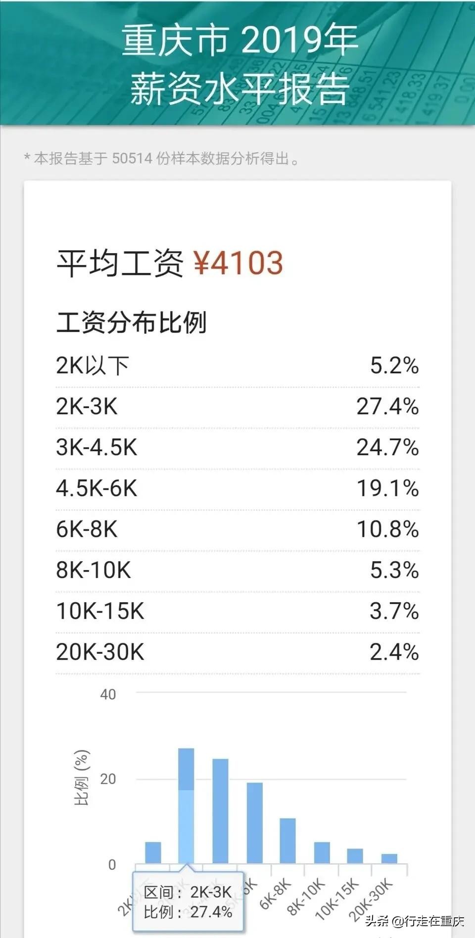 而小编拿到了一份网上流传的一份根据50000多份样本分析,重庆市2019年工资分布比例的图,根据图片显示的信息,重庆的平均工资是4103元,大部分人的工资待遇在3000到4500元,其次是2000到3000元,只有这两个区间的人最多。