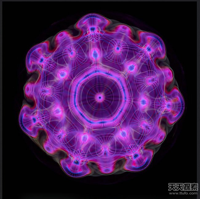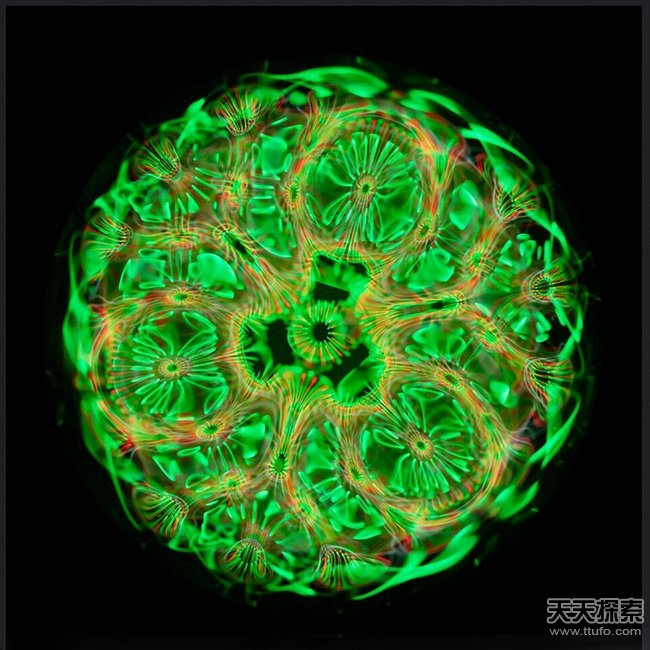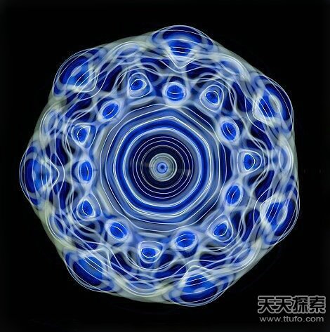 在Linden Gledhill镜头下,这些声波的图像颜色艳丽夺目,变幻多端,你能从弯曲回旋的线条中感受到声音的颤动。艺术家通过科技和智慧打破了听觉和视觉的界限,带我们探寻了微观世界的奥妙。这些图像看起来像极了神秘的海洋生物,有的像水母,有的像乌龟壳,极富对称美、自然美。