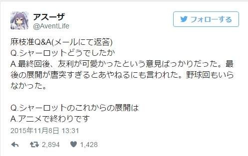 (观众提问麻枝准觉得《Charlotte》如何,麻枝准回答道,友利奈绪很可爱,最后展开有些突兀,棒球回确实好像是不需要的)