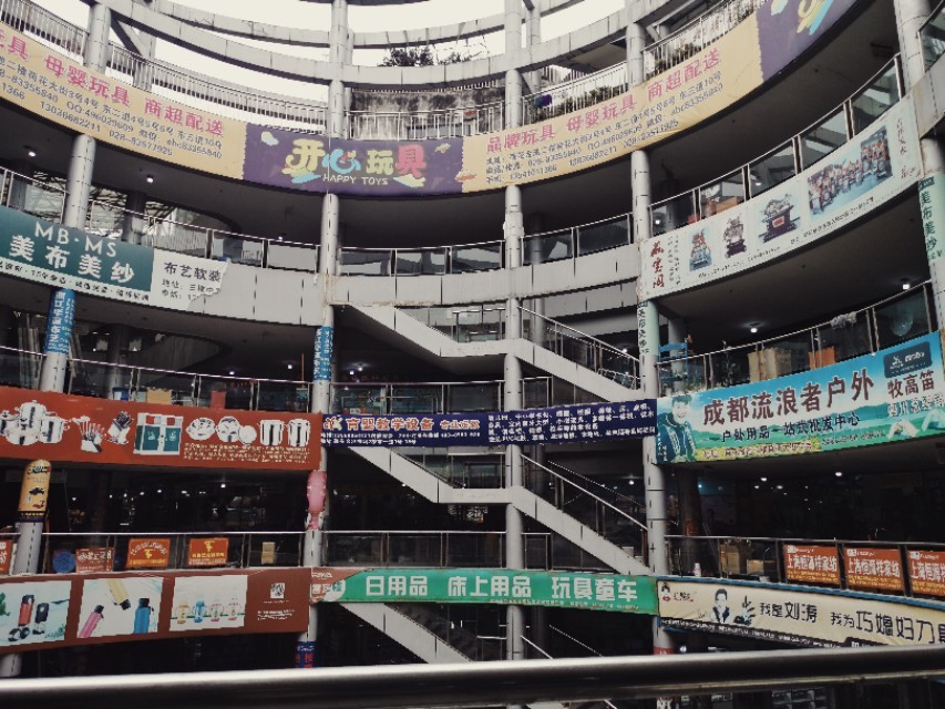 厨房用品,家纺,床上用品,儿童玩具,户外用具,应有尽有,可是找了半天没一家卖帽子的店铺,心里纳闷,重新一搜,原来荷花池批发市场分有区域,于是我又搜了服装批发,出了刚才的批发市场又准备去服装批发楼看看,刚走到对面发现也是批发衣服的大楼,走进去逛了一圈,明显人气不足,一楼童装店基本没有营业,市场里面的通道虽说不上脏乱差,味道是真的不好闻,尤其是底楼过道,路面坑洼不好走。