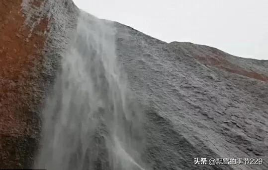艾尔斯巨石经历了上亿年的风雨侵蚀,形成了顶部平滑、四周陡峭的形状,并在崖壁形成了一些自上而下、宽窄不一的沟槽和浅坑。当暴雨来临的时候,雨水顺着四周倾盆而下,就形成了一个个美丽的瀑布,仿佛给整个巨石笼罩了一层巨大的雨帘,景色十分壮观。