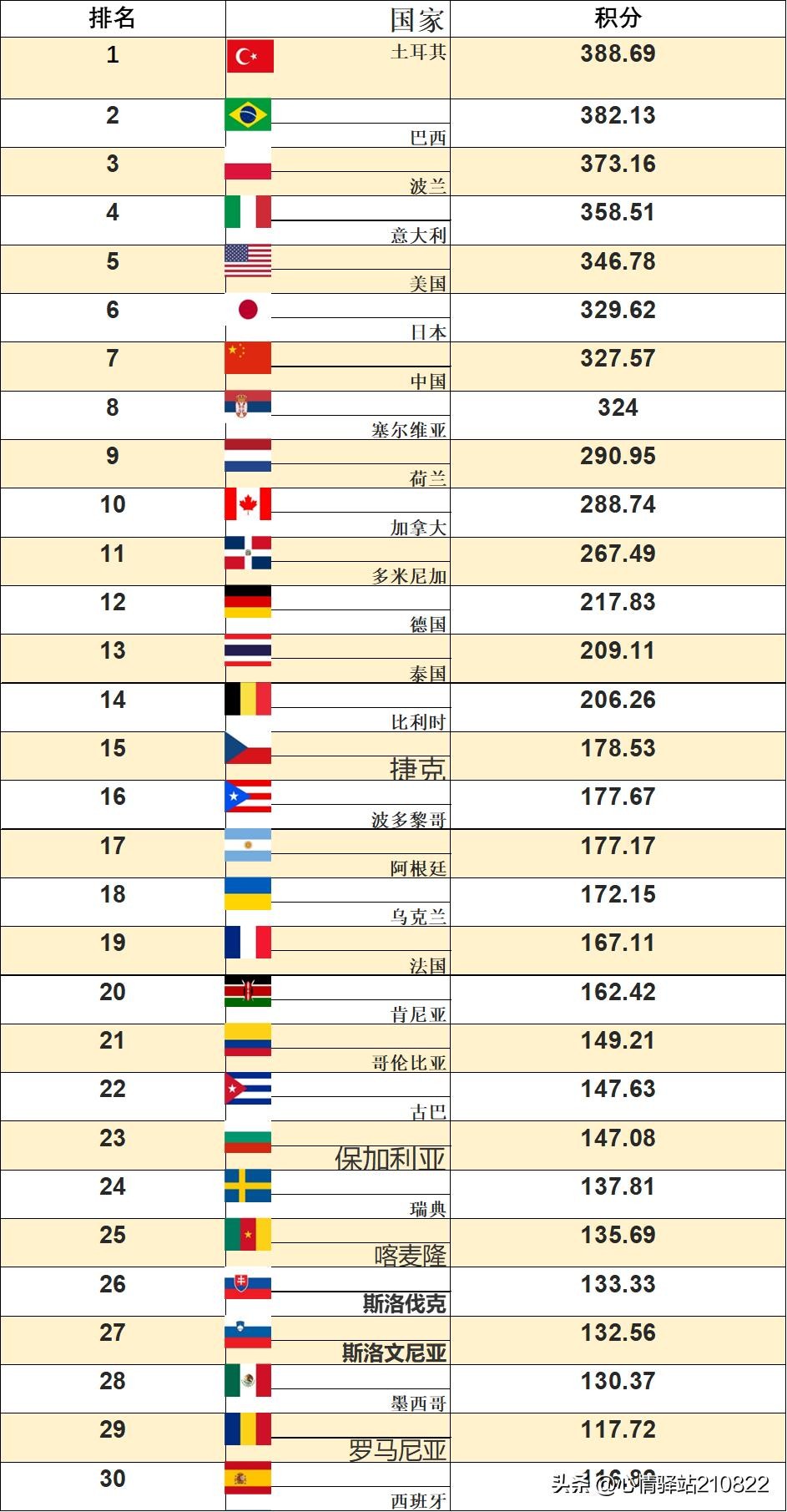 排名第1,土耳其,积分: 388.69 ;