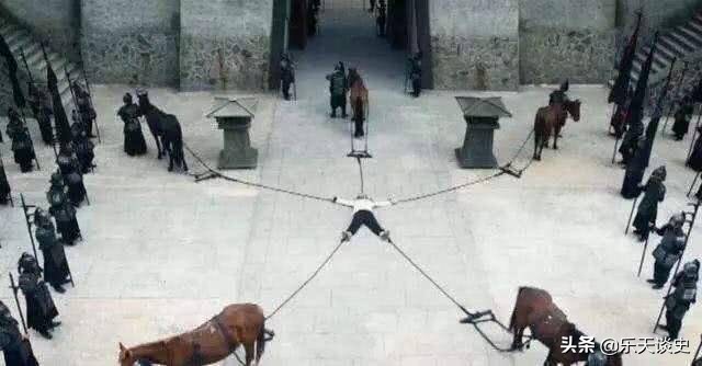 于是,有趣的事发生了,当行刑的马匹或牛累得气吁吁甚至口吐白沫倒下时,犯人可怜的四肢依旧连在躯干上。要把人的头跟四肢砍下来都得花不少力气,更何况是用拉扯的。而受刑人身受的苦处更可想而知。真到撕开的时候,恐怕受刑人已经不会觉得痛苦了。痛苦的是正在拉扯的时候。由此可见车裂之刑的残忍。历史,除了让秦始皇蒙羞的嫪毐受过车裂之外,为秦国的强大立过汗马功劳的改革家商鞅最终也落得个五马分尸的下场。