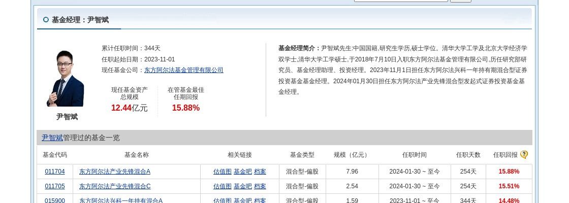 简历显示,尹智斌先生:中国国籍,研究生学历,硕士学位。清华大学工学及北京大学经济学双学士,清华大学工学硕士,于2018年7月10日入职东方阿尔法基金管理有限公司,历任研究部研究员、基金经理助理、投资经理。2023年11月1日担任东方阿尔法兴科一年持有期混合型证券投资基金基金经理。2024年01月30日担任东方阿尔法产业先锋混合型发起式证券投资基金基金经理。
