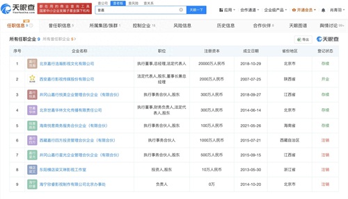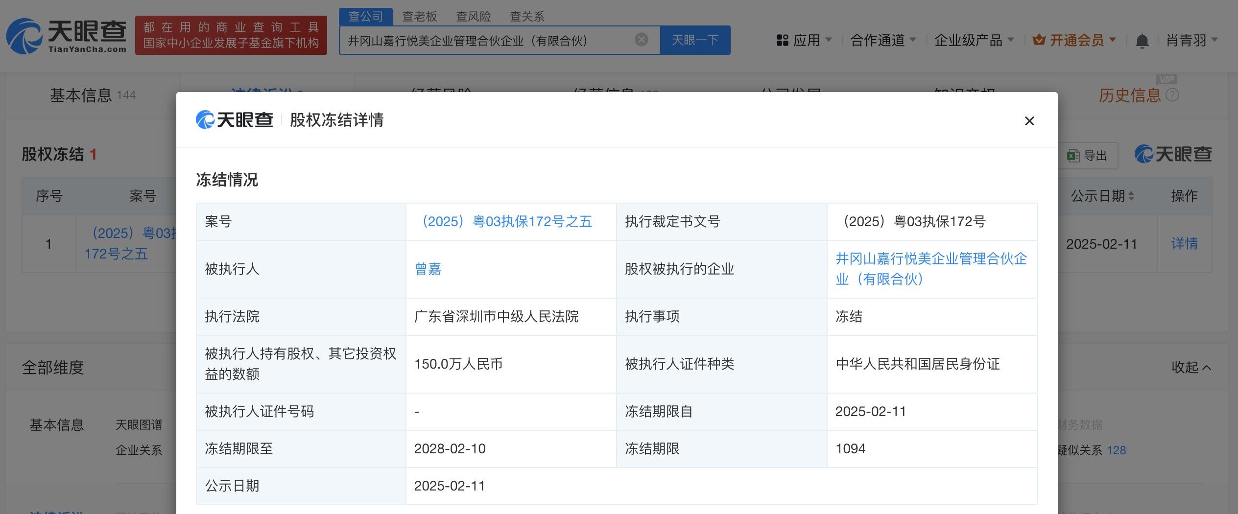 天眼查法律诉讼信息显示,近日,嘉行创始人曾嘉新增两条股权冻结信息,股权被执行的企业分别为井冈山嘉行悦美企业管理合伙企业(有限合伙)、海南悦意商务服务合伙企业(有限合伙),冻结股权数额分别为150万元、67.5万人民币,冻结期限均为3年,执行法院为广东省深圳市中级人民法院。天眼查显示,曾嘉名下共关联9家企业,其中5家为存续或开业状态,包括北京嘉行浩瀚影视文化有限公司、西安嘉行影视传媒股份有限公司等,曾嘉在上述企业中分别担任执行董事、总经理、法定代表人等职务。