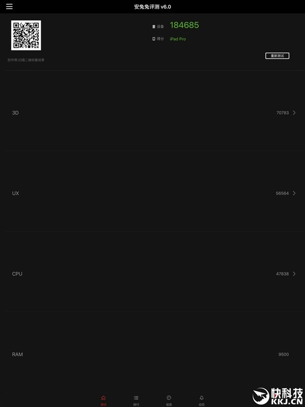 最近一次对A9X的跑分来自喜闻乐见的安兔兔,成绩是184685,在新的Tegra出来之前,绝对的跑分第一王。