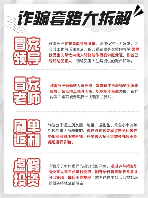 天上不会掉馅饼,贪图小利只会吃大亏!诈骗分子会通过电话、短信、卡片、微信、抖音等途径散播诈骗信息,添加好友,若关注此类信息便容易掉入诈骗陷阱。诈骗分子会让你安装注册投资APP,诱导你到银行取现交给陌生人,让你在平台查看余额,编造注资成功及投资获利的假象。诈骗分子抓住你想获利、提现、挽损的急切心理,以各种理由骗你反复加大投资,或以数据错误、账户冻结等为借口,要求你交纳保证金核销后才能全部回款,一步步引诱你落入他们精心设置好的圈套中。