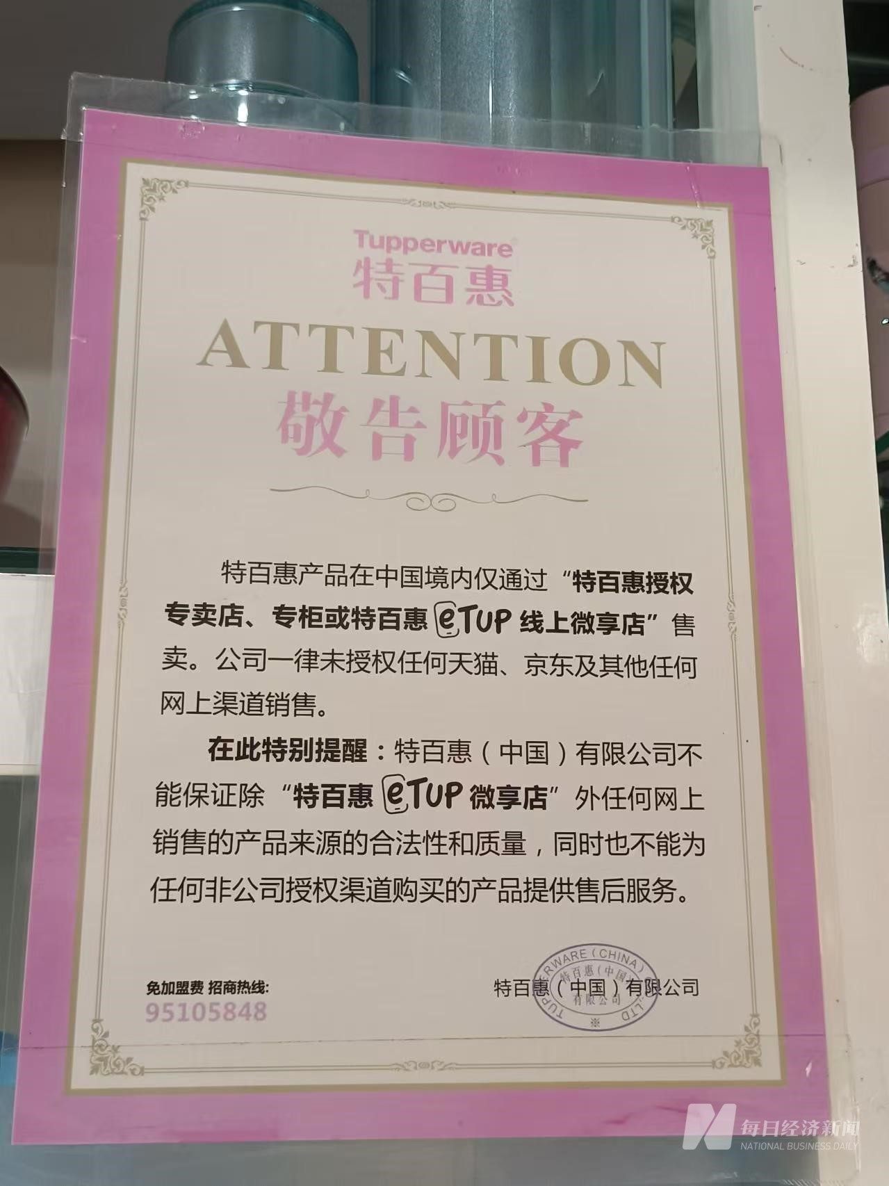 特百惠某门店挂出的公告,否认天猫、京东店的合规性。 图片来源:每经记者 丁舟洋 摄