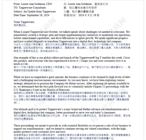 9月18日,特百惠全球CEO劳里-安-戈德曼在致合作伙伴说明破产保护的信件中,也提到了产品更新,并将其视作战略转型的一个案例。“其中一个例子是我们本周在全球推出了特百惠大T杯。我喜欢这个产品,每个使用过它的人都会喜欢它。”