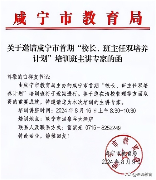 随着办学声誉与日俱增,党委书记白祥友倡导的激潜教育,成果显著,备受关注,好评如潮。在名校联盟·高中校长管理研修班,第十九届全国中学发展研讨会,第三届中学教育教学高峰论坛暨新时代教育家精神研讨班,由湖北省咸宁市教育局主办的首期“校长、班主任双培养计划”培训班,由衡水学院主办的新时代教师教育协同创新研讨会暨名校长讲堂,白祥友书记受邀参加,并做《新时代高中办学思想研究与实践探索》专题报告,来自全国各地近万名教育同仁现场参加活动。