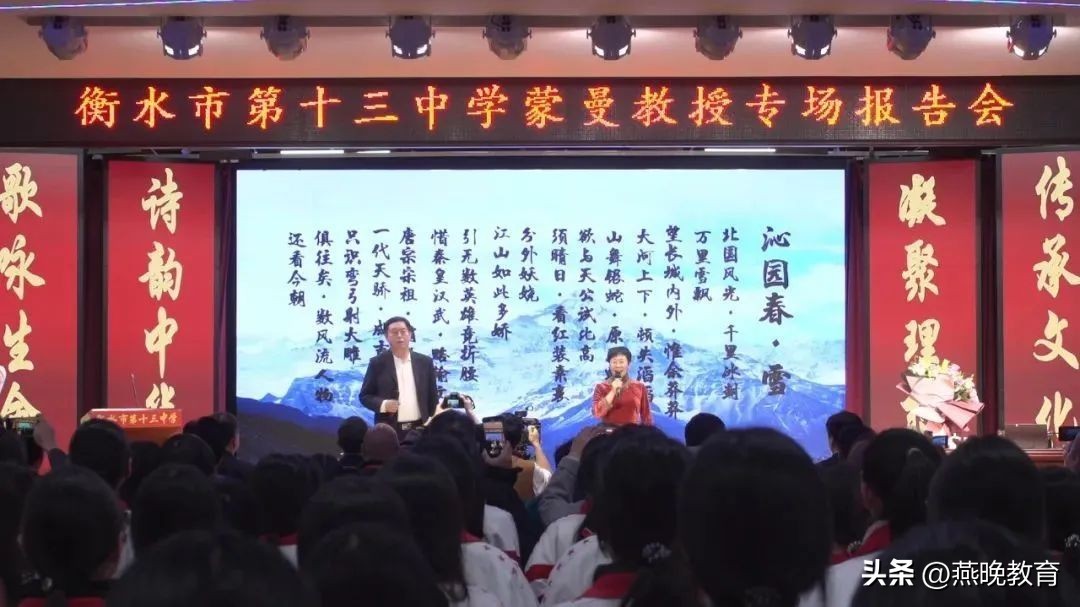 著名教育专家、北京宽高教育集团总校长王金战教授莅临衡水十三中作专题报告,为高三学子高考赋能。全国著名励志演说家陈州老师为我校师生带来了一场震撼心灵的励志报告,衡水日报专版报道《当衡水十三中遇见“讲者”陈州——一场“激爆潜能”的灵魂碰撞》,军事专家、国家安全战略问题专家,原国防大学金一南教授走进衡水十三中,参加“强国有我,激潜奋进”的国旗传递、升国旗活动,并带来题为《中国的百年沧桑到民族复兴》的精彩讲座。衡水日报整版报道《一场关于爱国主义教育的“问”与“答”》。郑强教授走进衡水十三中作《中华复兴的教育与文化根基》专场报告,《一场激潜教育理念与“郑”能量的汇合》整版发布。蒙曼教授开展题为《中华民族的诗与歌》的专题讲座。来自各界的领导来宾及全校师生共同聆听,领悟民族文化内涵。
