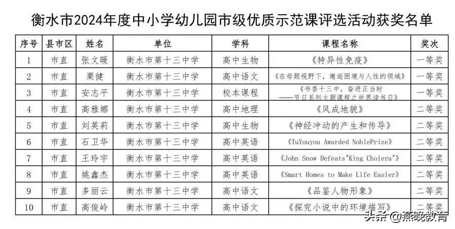 在2024年度中小学幼儿园市级优质示范课评选活动中,安志平、张文暖、栗健荣获一等奖,高雅娜、刘英莉、石卫华、王玲宇等七名老师荣获二等奖。周颖、王荣娥等四名老师在衡水市普通高中学科命题征集与评选活动中荣获一等奖,张玲红、张玲、孙倩荣获二等奖。梁真、张磊两名老师荣获衡水市普通高中音体美教师基本功大赛一等奖。在衡水市中小学体育教师优质课比赛中,王月敬老师荣获一等奖,王斌荣获优秀指导教师奖。学校报送的《“六位一体”开发应用赋能教育信息管理》案例成功入选《2022-2023年数字化赋能教育管理信息化建设与应用典型案例》,成为河北省唯一入选的中小学案例。《青春的蜕变》被评为衡水市首届中小学校园心理剧展演优秀作品。