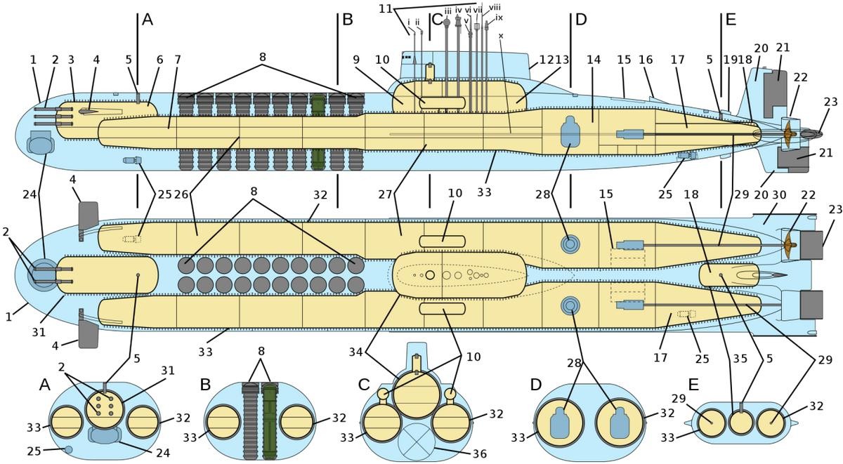 “台风”级的结构非常独特,其艇身有两层船壳,最外层是非耐压壳体,在这层壳体下还有两个分别独立的耐压壳体,而导弹发射单元也别出心裁的布置在了两个耐压壳体之间。
