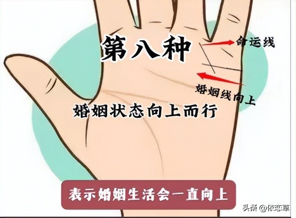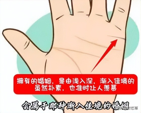 2、如果婚姻线向下接近命运线,表示婚姻生活会一直向上而行,会遇到属于自己的感情归属,遇到自己的知心爱人,然后一起生活,生活会蒸蒸日上。