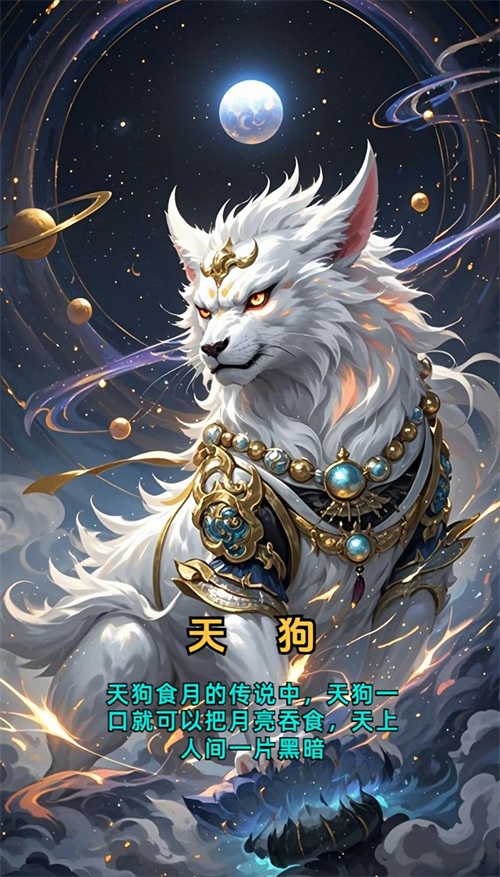 天狗形状像狸猫,白色的脑袋,叫声像 “榴榴”。《山海经・西山经》提到:“阴山,有兽焉,其状如狸而白首,名曰天狗,其音如榴榴,可以御凶。” 它的能力是可以御凶,也就是能够抵御凶险。虽然它不像其他凶兽那样具有强大的攻击性,但它的出现往往伴随着一些特殊的现象,让人捉摸不透。天狗喜欢生活在幽静的山林之中,以山中的小动物和植物为食,偶尔也会出现在人类的村庄附近,其御凶的能力为它增添了神秘色彩。