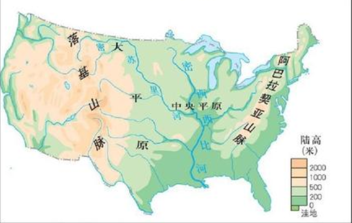 美国有东部海岸平原、中央大平原,西部山间大盆地、沿海也有很多平坦土地。