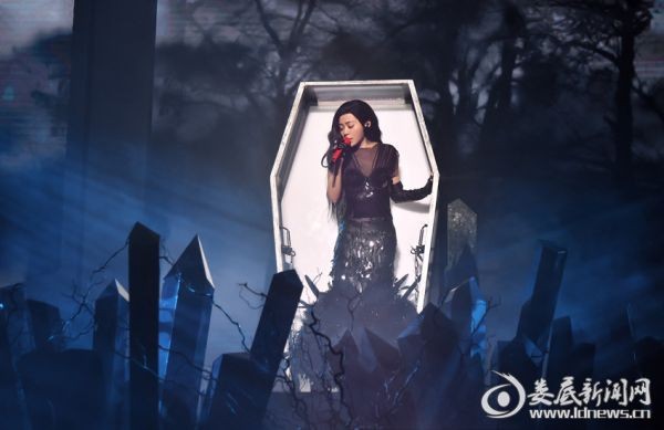 像是置身神秘冷峻又斑驳荒芜的中世纪古堡,张靓颖大胆地躺在一口水晶棺材造型的道具中,从舞台中央缓缓升起。四周黑曜石交错,伴随着开场曲《顺流而下》,荆棘丛生的藤蔓里黯影曈曈,预示着这条关于“珍相”的探寻之路悬念迭起。