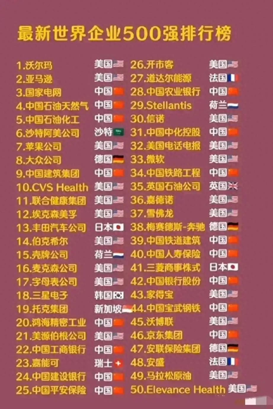 看看这份名单前50名,首先看数量,咱们占了16席,占比三分之一,只比美国20家少4个。但总体榜单咱们超过美国6家,这充分说明了这些年咱们国家经济蓬勃发展,老百姓生活富足,已经有了和美国人掰手腕的实力。那些唱衰我国经济的言论不攻自破,就问那些人尴尬不?