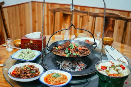吊锅,顾名思义,这是一样和"吊"有关的菜。菜经过炒制,将有铁绊的铁锅套在挂勾上,盖着火苗。待锅烧热后,放入做好的食材,或把笋干、腊肉、或把萝卜、酸菜,或将青菜、豆腐置于其中,加水、放盐,香料等烹煮。若要调味,就放点干辣椒壳与生姜片之类。锅里煮得爆爆跳,香气四溢,一边大口喝酒,一边大口吃肉,此情此景确实别有一番风味。有土鸡吊锅、羊肉吊锅、牛肉吊锅、、土鹅吊锅、猪排吊锅等。
