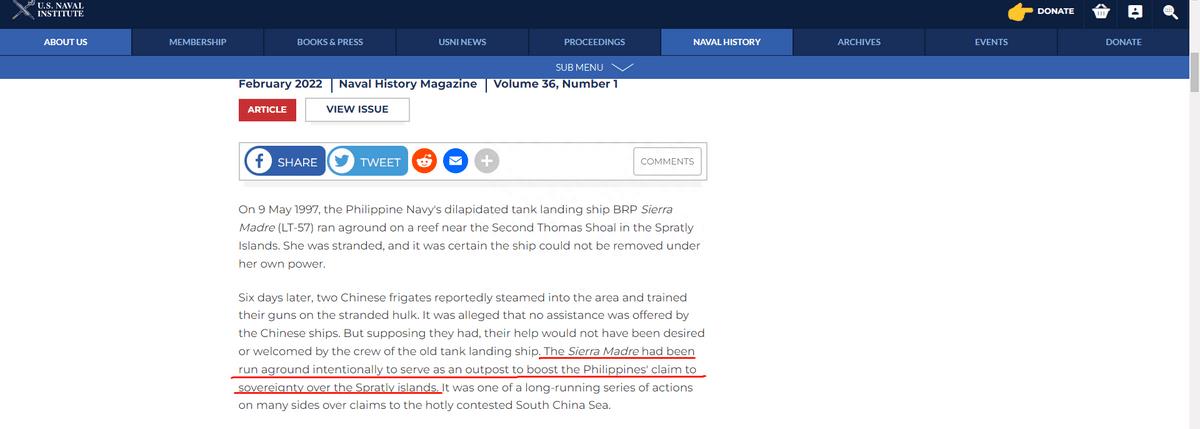 此外,美国海军协会网站的历史纪录中也清清楚楚地写着马德雷山号是故意搁浅,目的是成为菲律宾对南海群岛主权声索的前进基地。