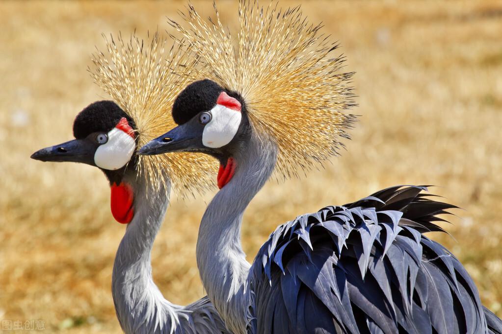 形态:毛色黑,双翼带白,头上长有金色的羽冠,冠鹤的名称由此而来。习性:过雌雄双栖或群居的生活,一到青春期,雄鹤会翩翩起舞,以获得雌鹤的青睐。平常以昆虫、鱼类和榖类为生。