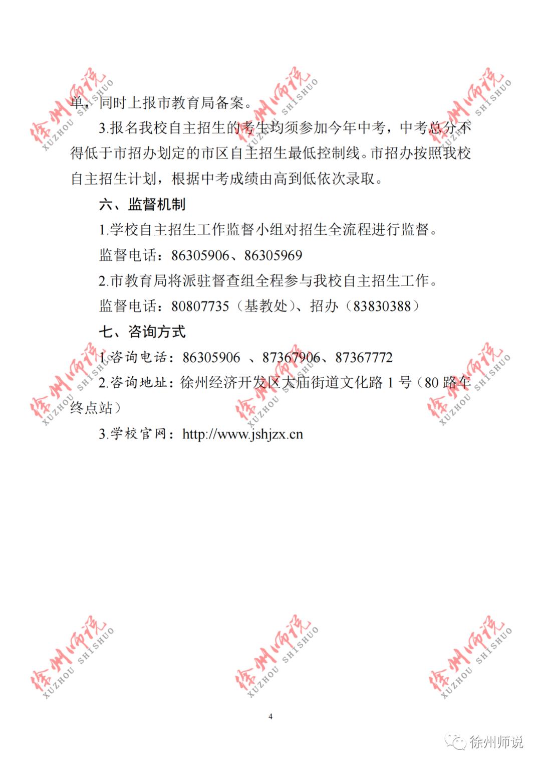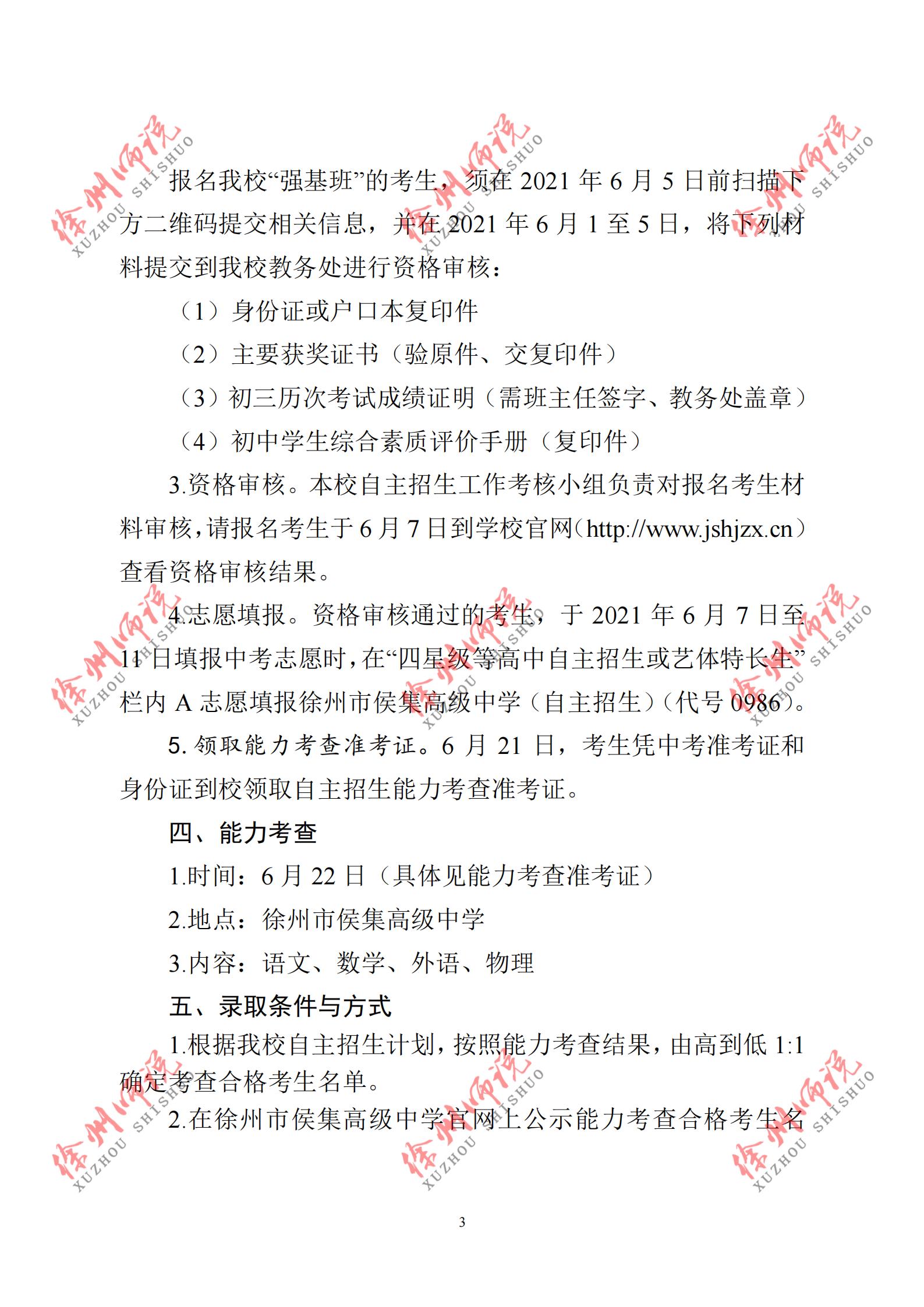 2.志愿填报:2021年6月7-10日考生在网上自行填报。志愿填在报名表“四星级高中自主招生或艺体特长生一栏”,学校代码: 0904;学校名称:徐州高级中学(自主招生)。6月15-16日凭中考考试证带1张2寸彩色照片来校换取自主招生加试证。