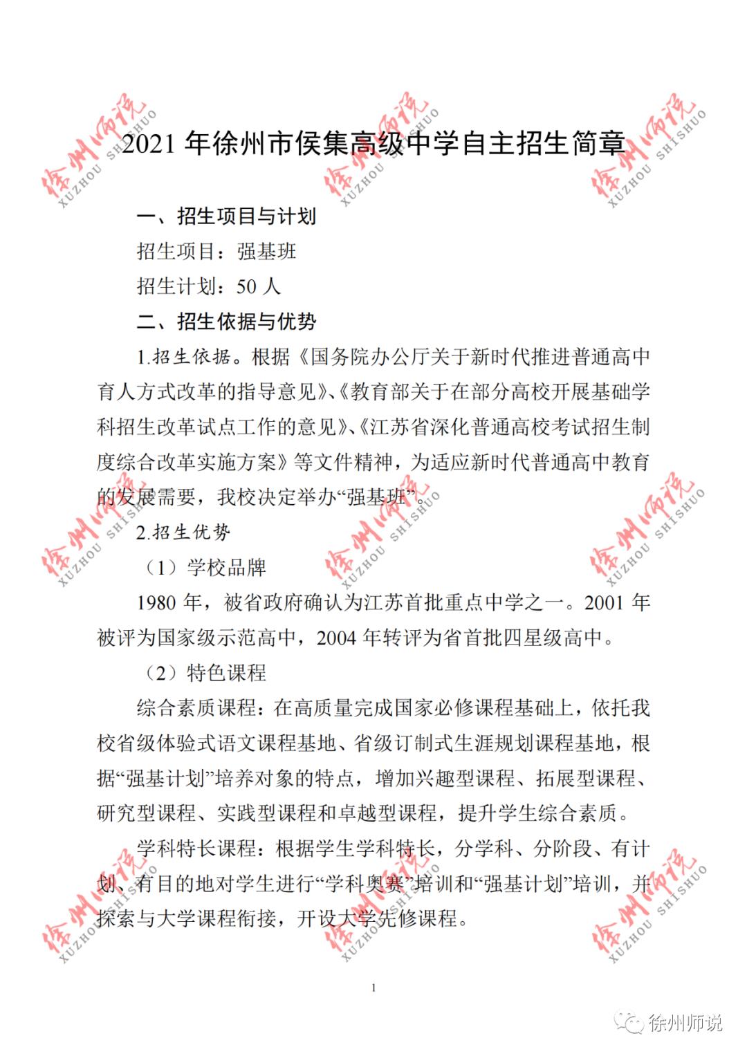 最新!2021年徐州一中、三中、侯集、徐高、三十六自主招生简章