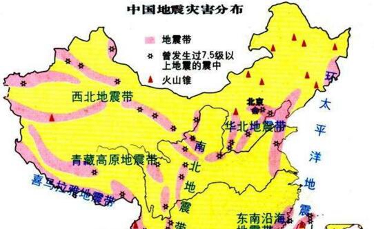1、东南部的中国台湾和福修沿海 2、华北的太行山沿线和京津唐地域 3、西南青躲高本和它边际的四川,云南二省西部 4、西部的新疆,甘肃和宁夏