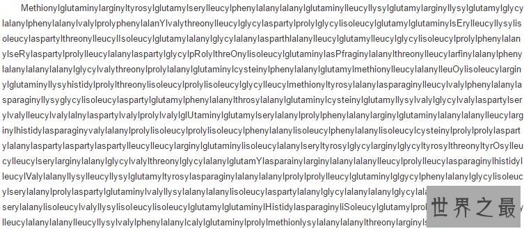 网传世界上最长的英文单词:色氨酸合成酶a蛋白质(一种含有267种氨基酸的酶)的化学名根据英文造字规则,一共有189819个字母,全部读完需要花费约3.5小时。以下单词有1913个字母,全部读完需要花费约25分钟,是它的一类。