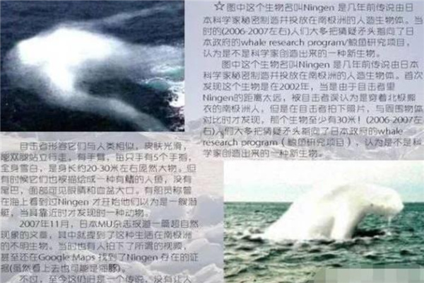 在2002年,南极的探险家们初次探测到了ningen怪物的踪影。目打者在第一眼睹到怪物时,与怪物的隔绝很远,因此,目打者起初只以为这个怪物是南极洲原地的人,不过其衣着北极熊的外衣干假装,因此才会浮现特殊异的体态特性。然而是目打者仍用相机将这个不明生物的局面记载了下来,便在目打者拍摄下照片后,其便觉得差错于劲。