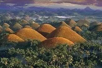 神奇的巧克力山位于菲律宾保和岛中部,是由石灰岩堆积成的小山丘,这些山丘有的是锥形,有的是圆顶,它们像田野中的干草堆紧紧挨在一起。山丘上覆盖着一些杂草,在雨季时这些草呈现吕策,而在旱季是,由于太阳的暴晒,这些杂草被烤成了褐色,就像巧克力的颜色,巧克力山丘的名字便是这样得来的。