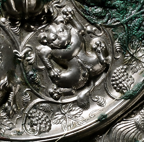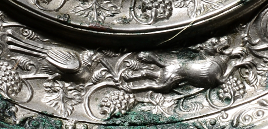 其装饰图案糅合了唐代与西域各国的文化符号。镜背面图案主要由高浮雕式的若干瑞兽和葡萄枝蔓组成,形态各异的瑞兽穿梭嬉戏在葡萄藤间,充满了生气。