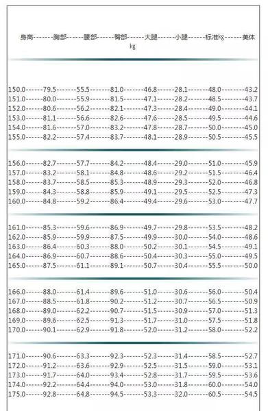 女生标准身材对照表,包括标准/美体体重、胸围、腰围、臀围、大腿围、小腿围等数据,其中标准体重数据是基础,标准三围、大/小腿围数据是标准身材的深入要求。以下是标准体重和标准三围进一步的探讨。