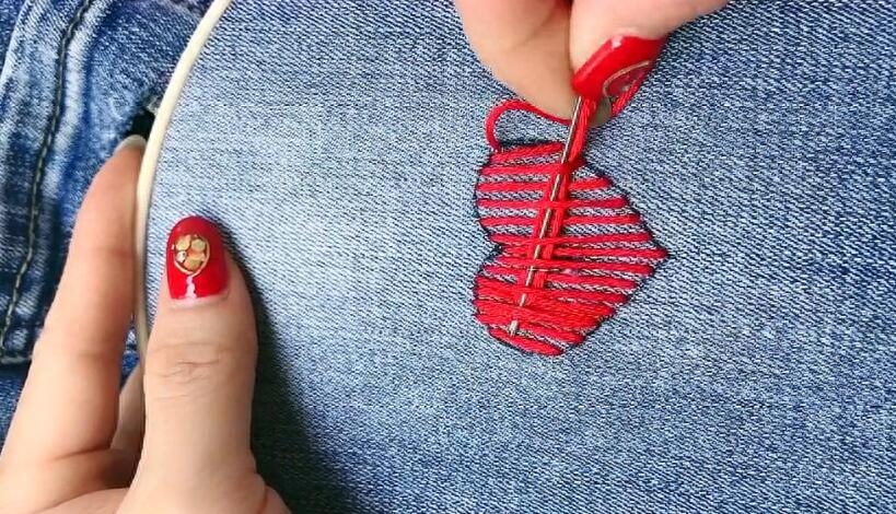 首先准备红线和黑线,用黑色针线围绕破洞缝一个心形的图案,然后换成红色针线,在心形的一侧画竖线向另一侧缝补,如果感觉线条细密可以多走几遍锋线,这样一个简单又好看的衣服破洞就修补完成了,是不是非常简单又美观呢,如果你破洞衣服,感觉动手试试吧!