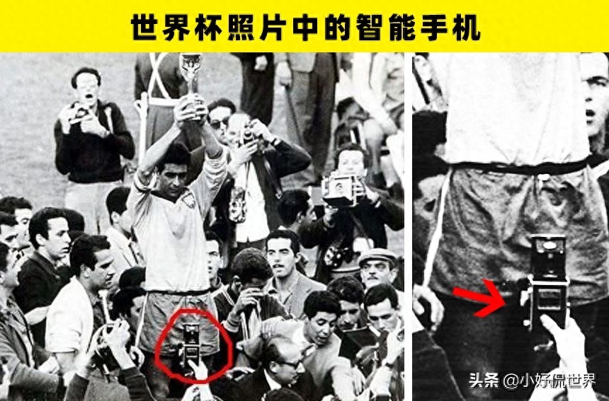 这张照片是1962年FIFA世界杯决赛中巴西战胜捷克斯洛伐克后所拍摄的。手持奖杯的人是巴西选手加林查。他在那一年当选为全场最佳射手。如果你朝着这张照片的下方看,你可以发现有一个男人似乎正在用手机拍摄他。难道这个人是穿越时空回到过去专门来见证这一历史性体育盛事的吗?