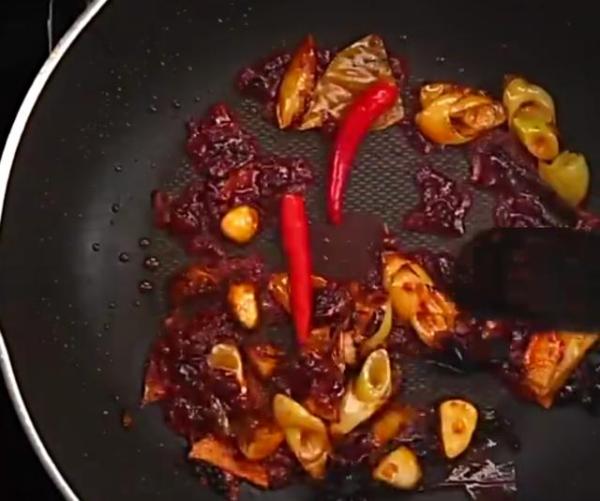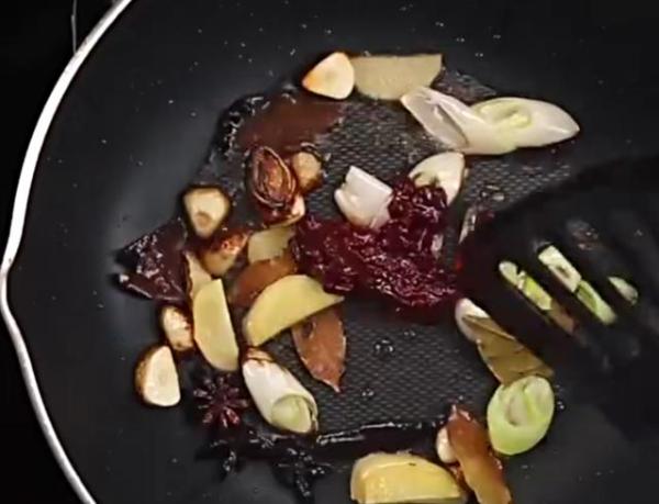 4、锅中炒出香味后,下入葱段10克、姜片5克、大蒜适量、香叶2片、郫县豆瓣酱10克小火继续翻炒,炒出红油。