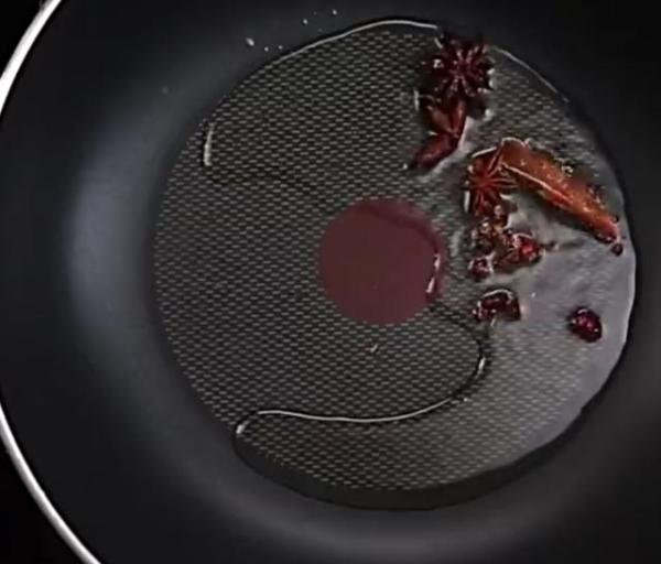 3、炒锅中加入少许底油,凉油时下入八角2个、花椒3克、小火煸炒出香味。