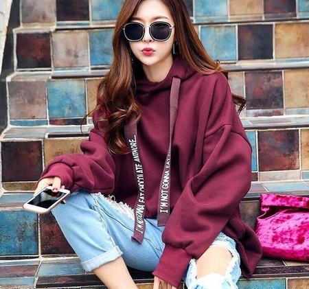 酒红色像一口融化在嘴里的蜂蜜软糯微甜温暖冬季,怎么搭配怎么穿都好看。我个人是推荐搭配一条牛仔裤,因为这种款式的卫衣非常百搭,搭配不同的裤子会显示出不同的风格气质。搭配一条牛仔裤,标准的热血青春范儿,街头感也是满满的,如果再配上一双小短靴,就一个字:酷!