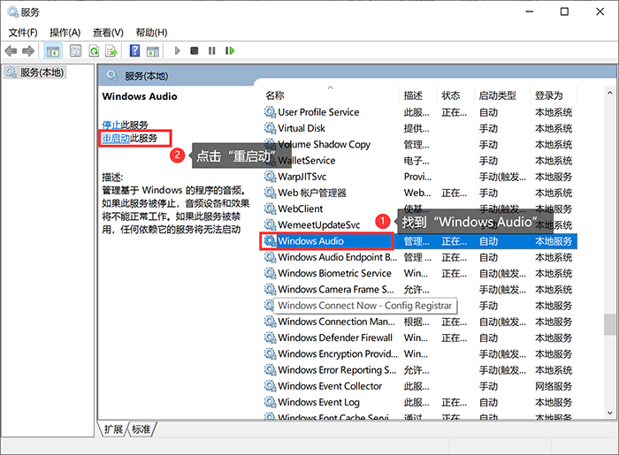 第2步:在右侧先找到“Windows Audio”,接着点击左侧的“重启动此服务”即可。