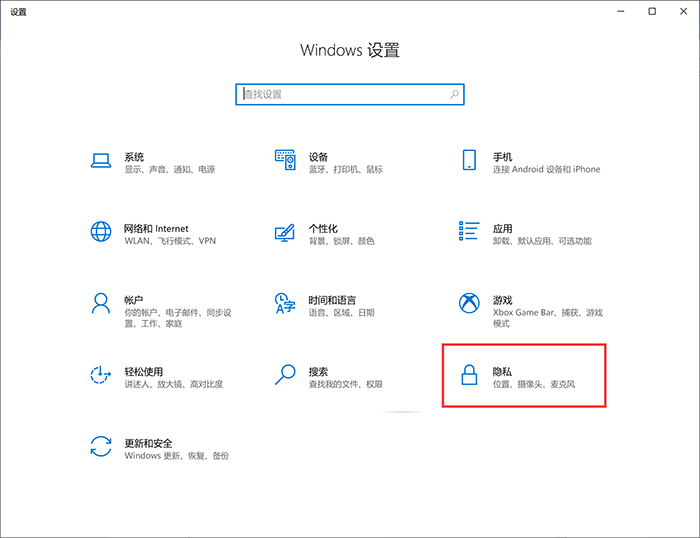 第1步:使用快捷键“win+i”,打开系统控制中心,点击“隐私”选项。