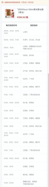 本周(7月5日-10日)全国多个省份的投放时间段,目前已在“i茅台”APP上公布。上海市、河南省、贵州省、北京市、广东省每日将在四个时间段进行投放;天津市、浙江省、河北省、江苏省等11个地区每日有三个投放时间段;山西省、新疆维吾尔自治区、内蒙古自治区、辽宁省等13个地区每日有两个时间段进行投放。