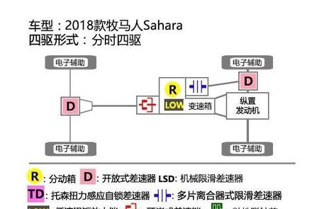 撒哈拉是世界上最大的沙质荒漠(俗称沙漠),以沙漠的名称命名很显然这一版本的牧马人是用来爬沙的,在这种路况中全时四驱才能适应性更强;所以牧马人撒版提供了4H Auto模式,直白的理解就是自动高速四驱,也就是全时四驱。实现全四自然是分动箱的特殊结构,该车的分动箱有2.72倍的扭矩放大倍率,在分动箱基础上集成了一组多片式离合结构的限滑差速器,其功能包括前后传动轴正常差速,以及利用离合器压紧对传动转的差速进行限滑而统一转速实现越野攀爬。